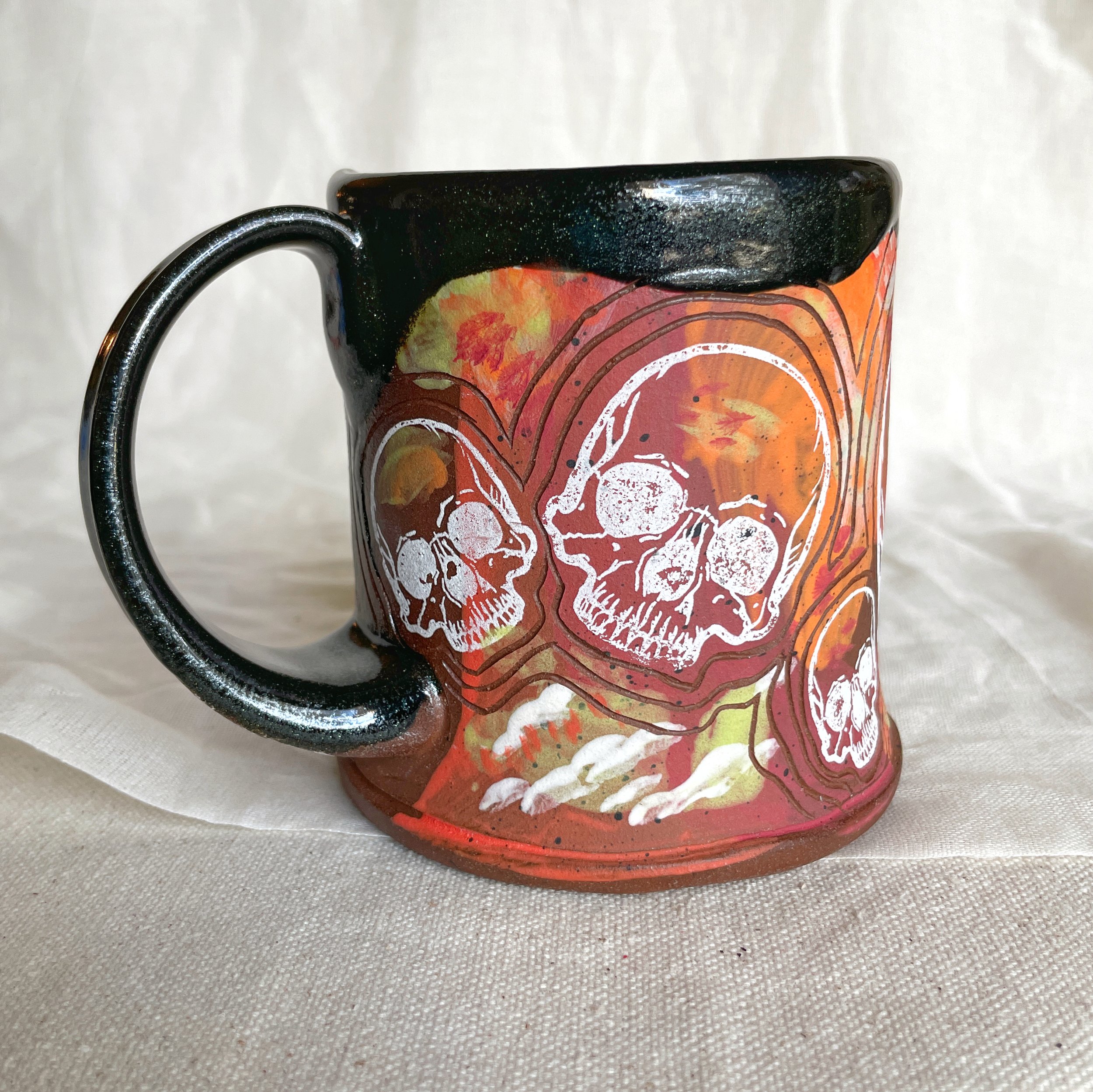 Skulls on Colorful Hand Painted and Hand Carved Mug, 15.5 oz